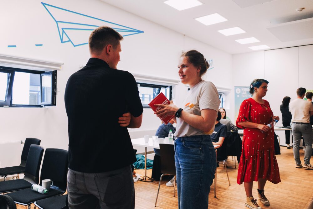 Konrad: Die teilnehmenden Führungskräfte arbeiten nicht allein an ihren Projekten. Sie werden systematisch begleitet: von uns Coaches, vom Team des Media Lab Bayern — und von einem Fellow, also einer externen Expertin oder einem externen Experten, die mit ihrer Erfahrung neue Perspektiven einbringen. So entsteht ein Umfeld, das nicht nach einem Workshop endet, sondern über Monate hinweg trägt. Wir begleiten von der ersten Idee bis zur Umsetzung, helfen den Fokus zu halten und Stolpersteine frühzeitig zu erkennen.