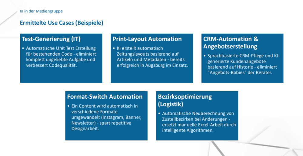 - Die Entwicklung strategischer Leitlinien für den KI-Einsatz innerhalb der Mediengruppe
