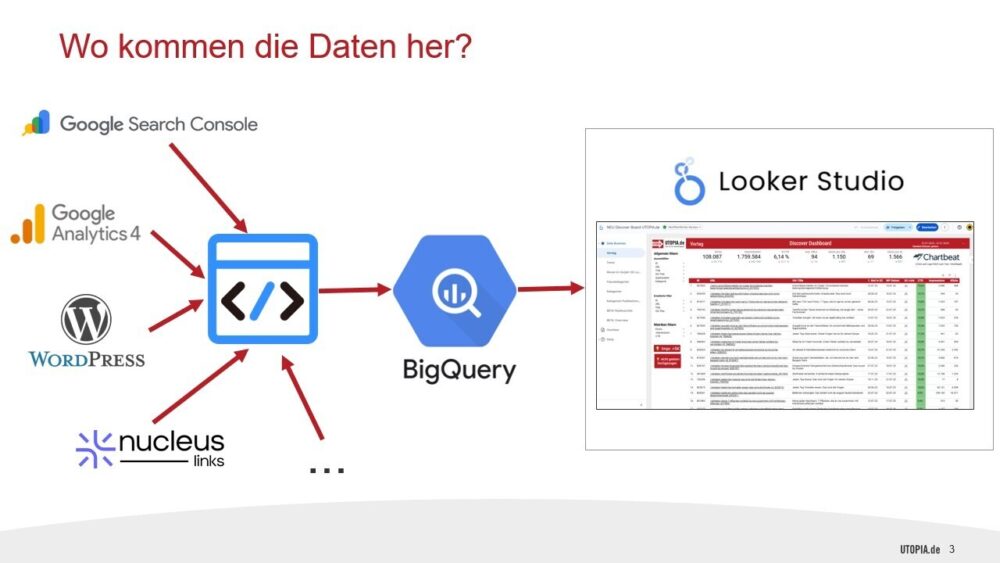 Im Bereich des redaktionellen Dashboards wurde ein weiterer Utopia-Kollege in den Projektstand eingearbeitet. Er übernimmt künftig den Fokus auf die interne Datenaufbereitung. Ein wichtiger Schritt, um die Folgemaßnahmen in sicheren Händen zu wissen. Dazu zählt insbesondere die Anbindung weiterer, bereits identifizierter Datenquellen an BigQuery — nach dem etablierten Schema, um ressortübergreifende Auswertungen zu ermöglichen.